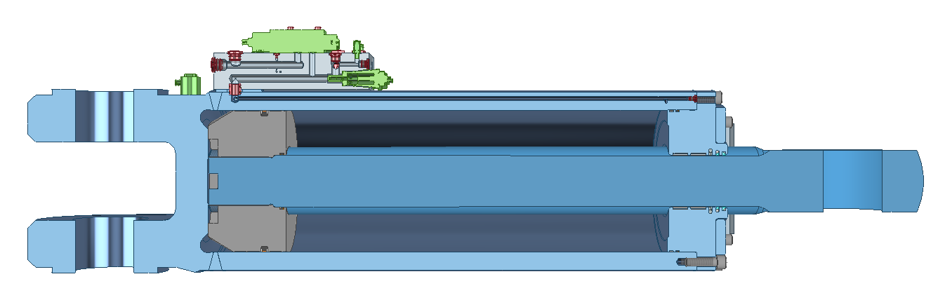 Digital twins and installation prototypes in CAD enabled the cylinder to be integrated precisely into the machine layout – without additional design effort on the part of the customer. Particular attention was paid to the limited installation space within the machine. Production took place on high-precision CNC machines, with a final pressure test.